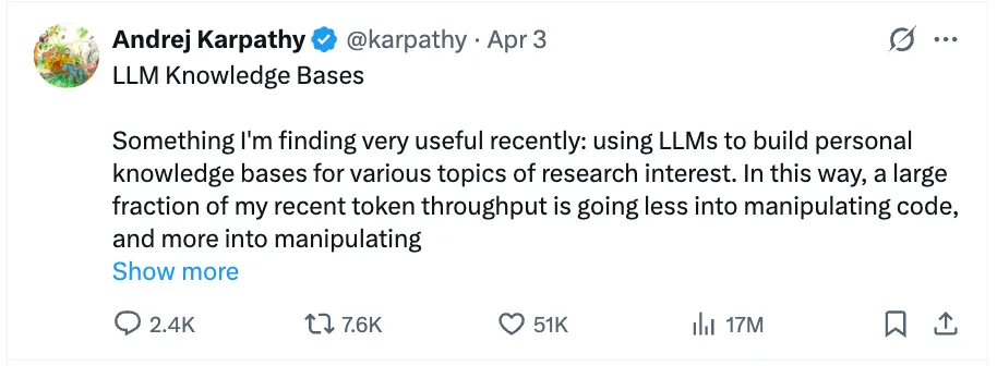 Last week, Andrej Karpathy tweeted that he's no longer spending most of his AI tokens writing code. He's spending them building a personal knowledge base. 12 million views. Half the internet suddenly convinced they need a markdown wiki to be productive.