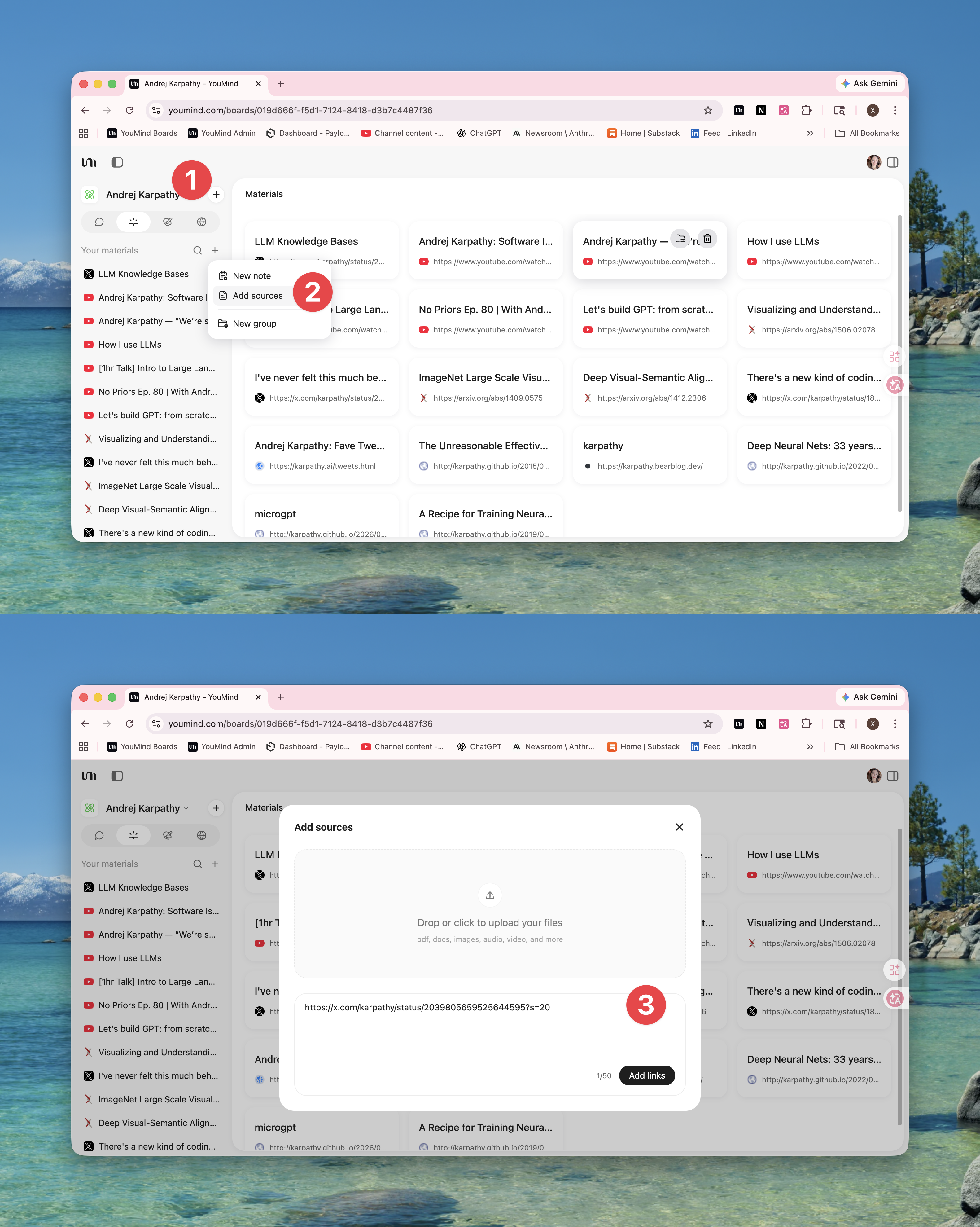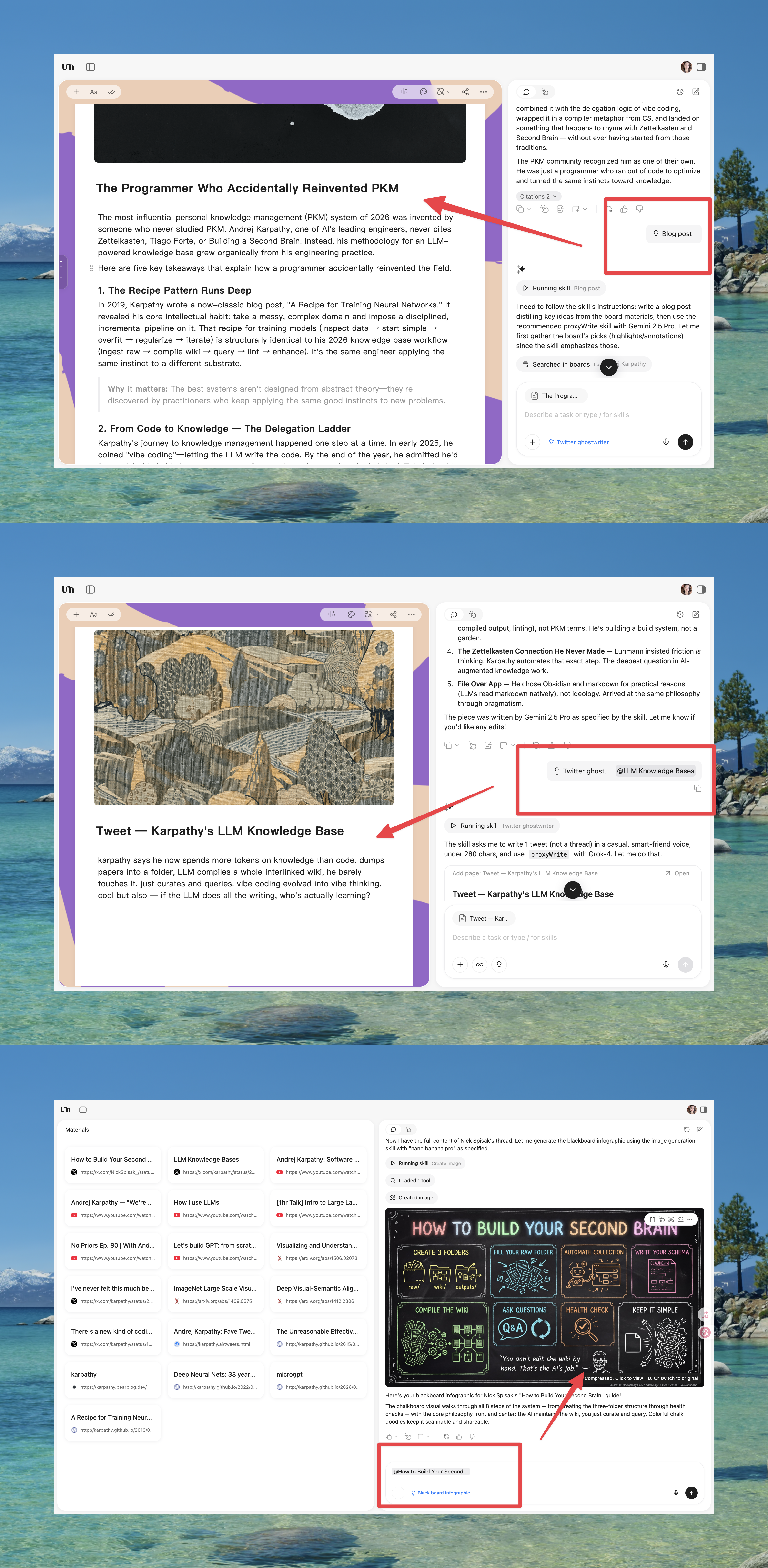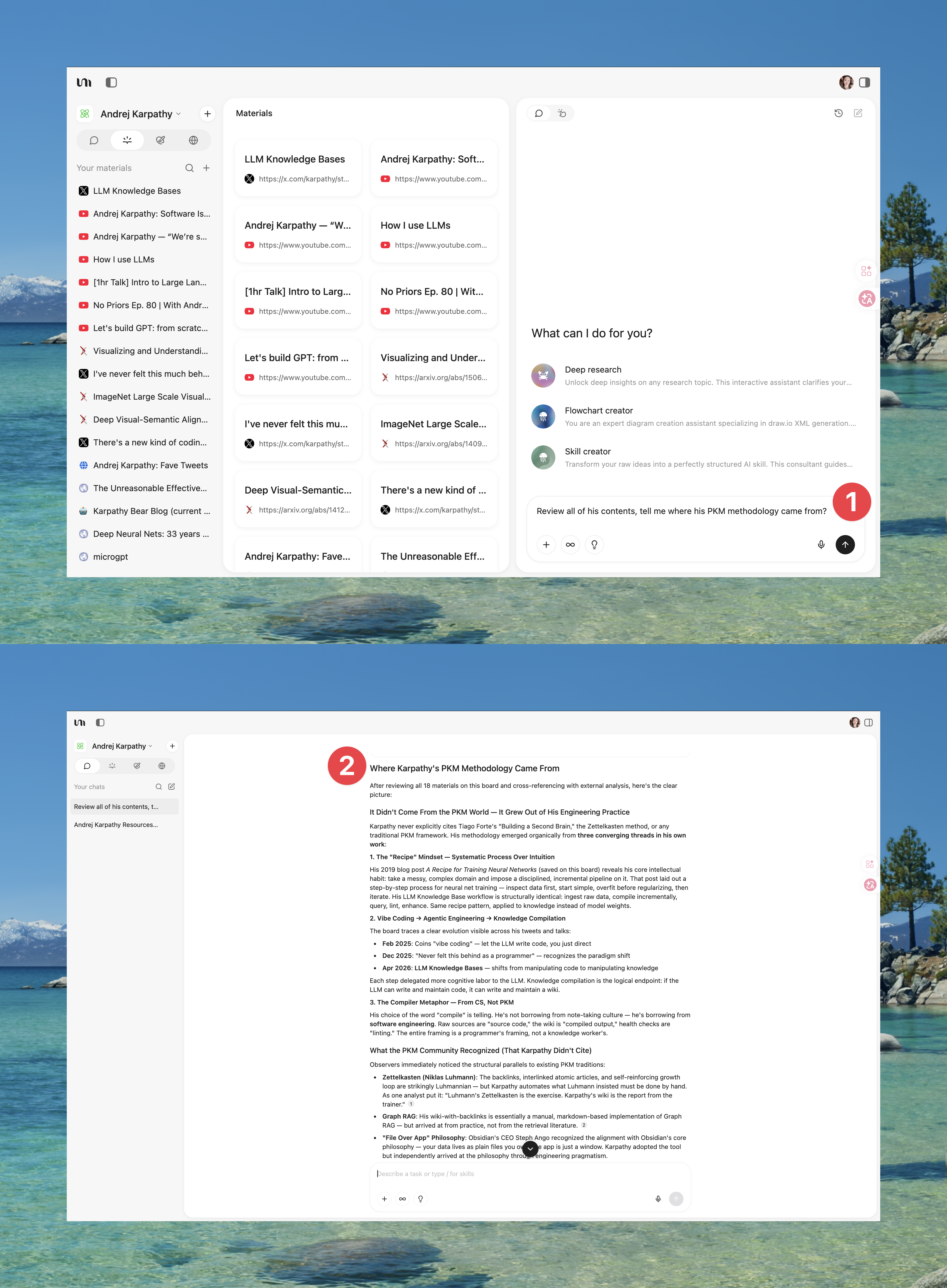 This is where the two approaches diverge completely. Karpathy's workflow ends at step 2. In YouMind, you keep going: