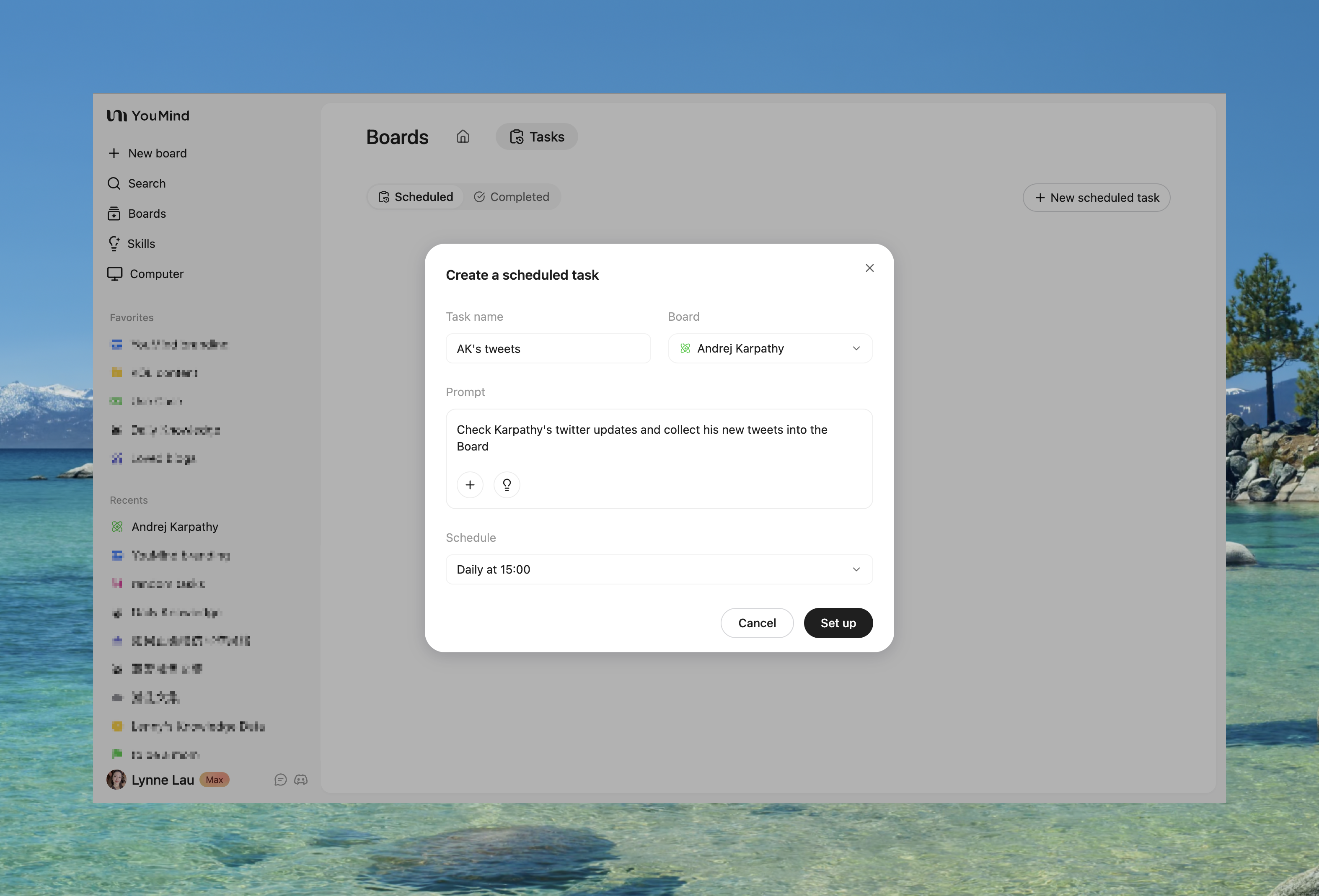 A Board isn't disposable. You can set up scheduled tasks to have YouMind automatically pull in new updates — say, Karpathy's latest tweets — and save them to the same Board over time. Your knowledge compounds instead of going stale.