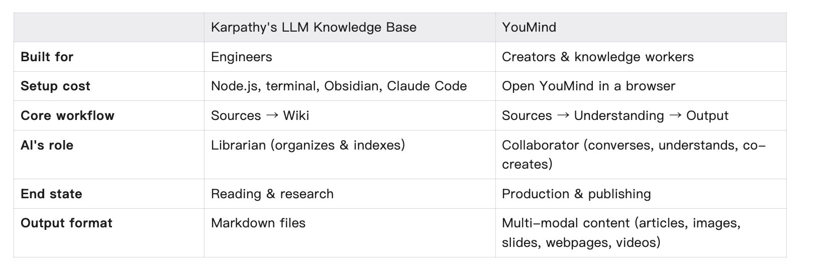 Looking at Karpathy's method and YouMind side-by-side, they represent two different "AI Second Brain" philosophies: