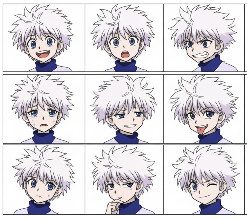 Generate a landscape oriented 3x3 grid image containing 9 distinct lo-fi style emoji expressions based on the core figure of the content