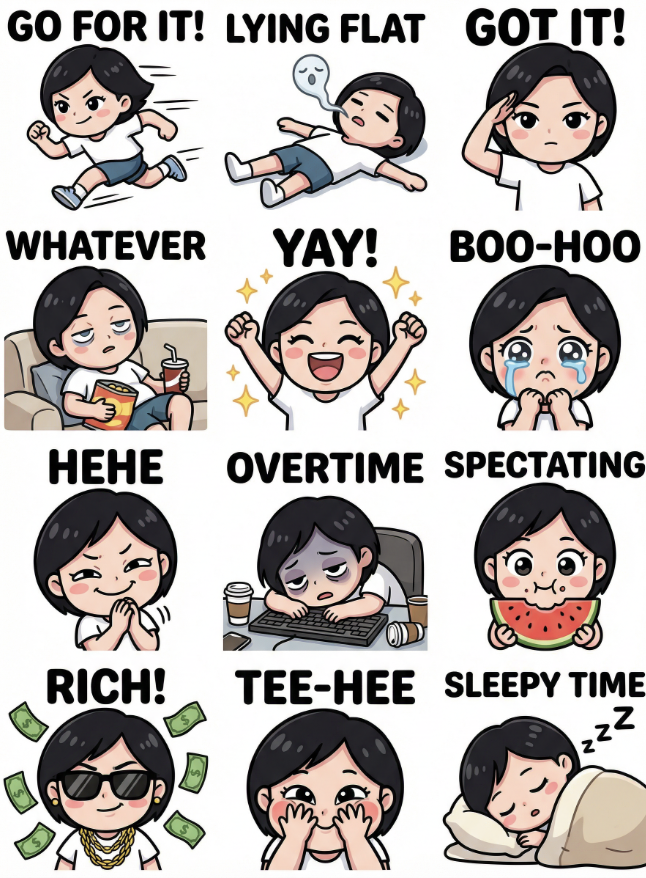 Sube tu foto y convierte tu personaje en emojis vívidos y consistentes. Genera al instante imágenes de cuadrícula 4×12 expresivas.