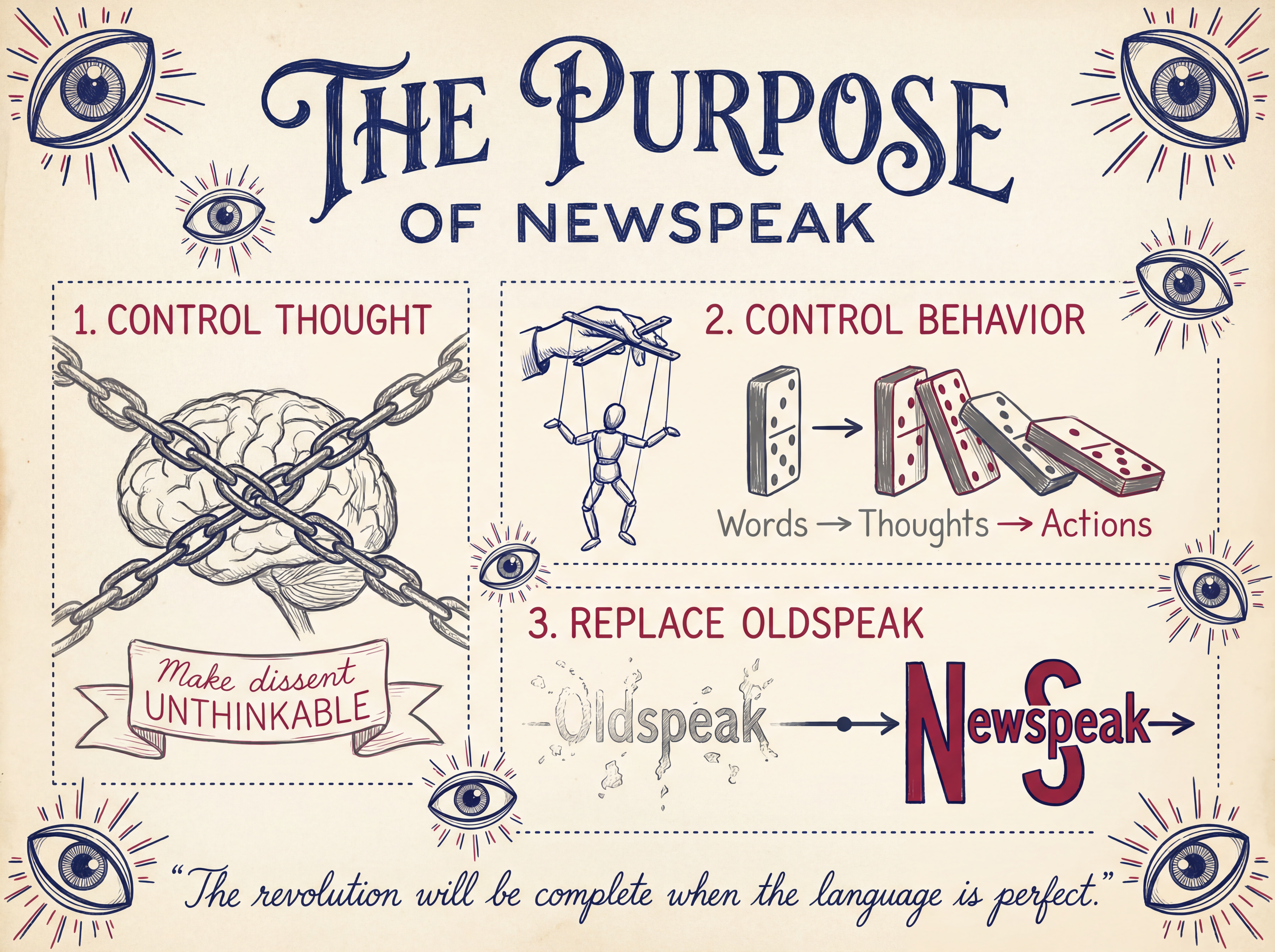 En 1984, le régime crée la Novlangue, une langue qui réduit l'étendue de la pensée humaine.