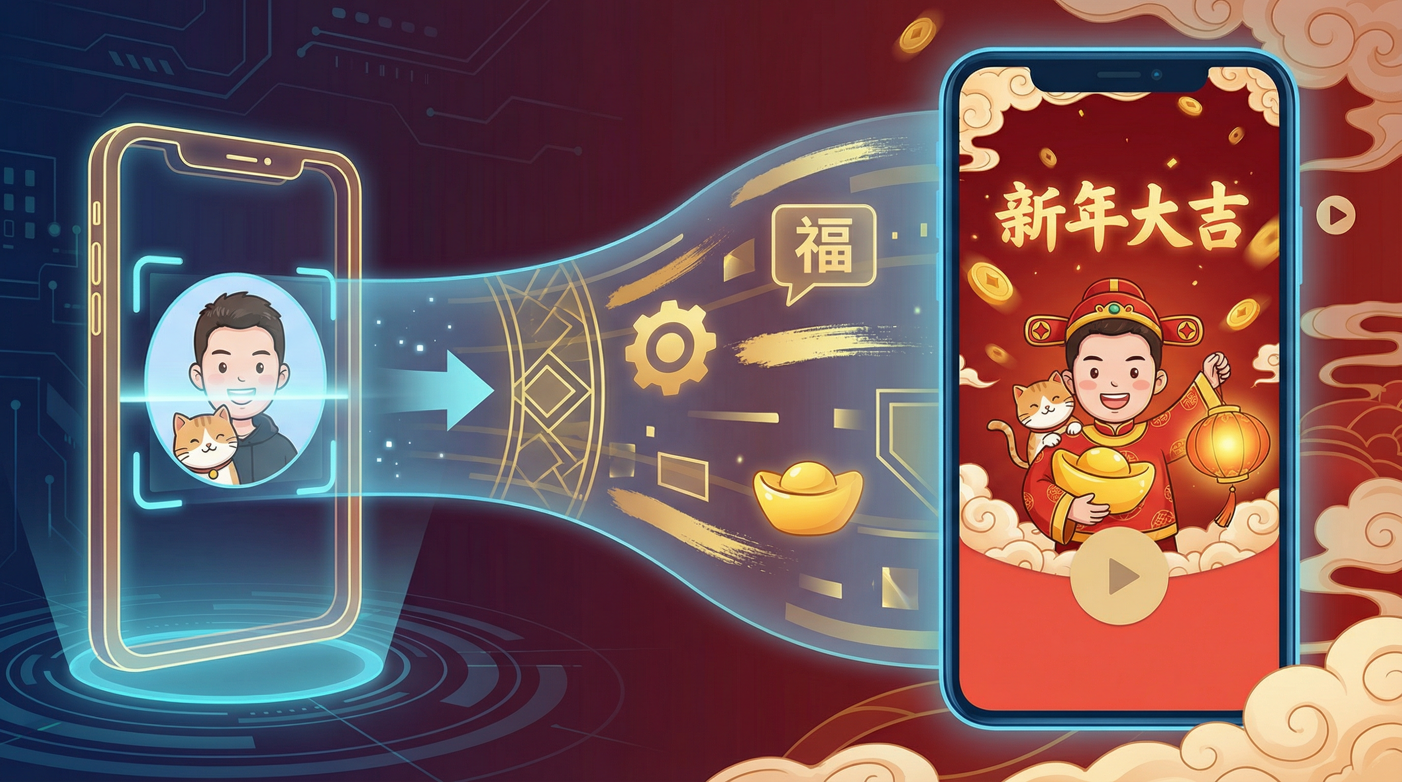 2. **Personnalisation paramétrée de la scène :** En collectant deux variables clés, « objet tenu » et « texte d'arrière-plan », grâce à un dialogue fortement guidé, une expression personnalisée peut être obtenue tout en conservant l'unité du thème du Nouvel An.