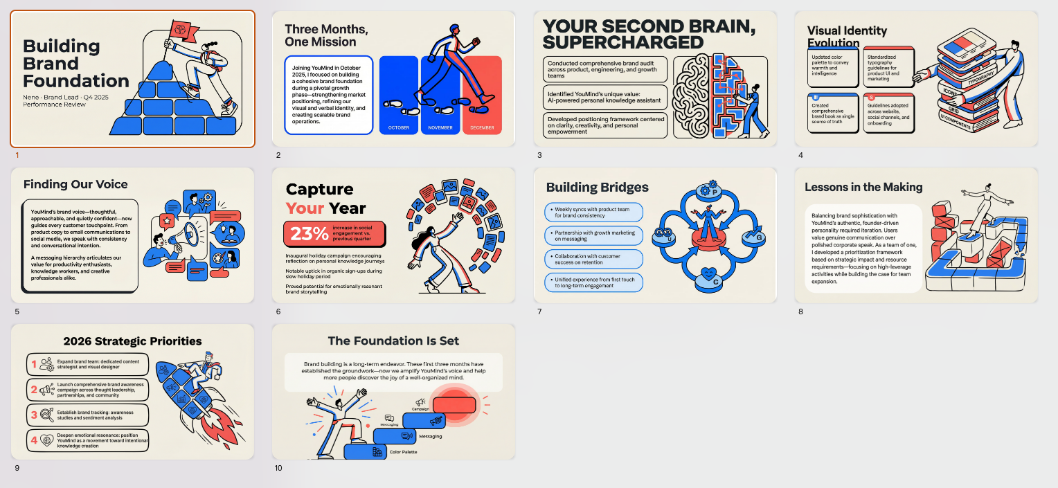 Transformez vos données en récits captivants grâce à cette compétence, et créez des rapports de fin d'année qui sortent de l'ordinaire. Elle allie des données centrées sur l'humain à un design dynamique et professionnel, sans être rigide, grâce à des traits dessinés à la main et une palette de couleurs unique. Idéale pour les entreprises technologiques à forte croissance, elle permet de réaliser des présentations qui reflètent fidèlement la dynamique de croissance et la synergie d'équipe.