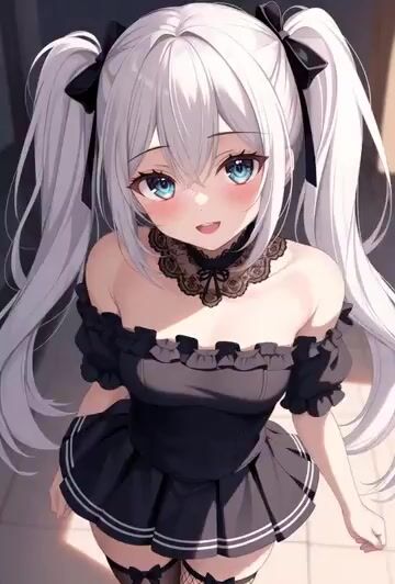 A detailed Grok Imagine prompt requesting a 10-second animated video featuring a cute, white-haired, twin-tailed girl with blue eyes, dressed in a black off-shoulder ruffled top and sailor skirt, representing the anthropomorphic character of xAI's Grok. The video should show her naturally moving her mouth while speaking the provided dialogue, with the camera focused on her upper body and lightly zooming in.