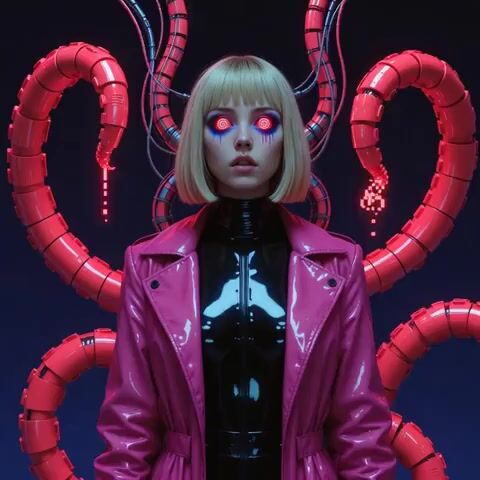 A highly detailed, technical prompt designed for Grok Imagine to generate a 10-second cyberpunk anime animation featuring the character Aletheia with glowing spiral eyes, a glossy pink trench coat, and eight robotic tentacles, emphasizing fluid slow-motion, hyper-coherent motion, and synced breathy voice audio.