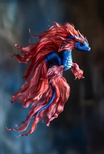 A Grok Imagine prompt for a silk dragon with blue scales, red hair, and flowing silk fins, inspired by the appearance of a beta fish.