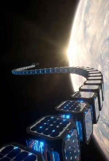 A highly technical Grok Imagine prompt for a 10-second cinematic sci-fi documentary video showcasing the 'Fuel of the Gods' orbital solar energy system, detailing the structure of a flexible hex-chain snake made of glowing hexagonal prisms.