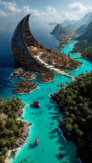 A shared prompt for generating a futuristic crescent-shaped megastructure rising beside a tropical island city, featuring golden architectural spires, lush greenery, and a dramatic aerial perspective under bright daylight. This prompt is suitable for video generation due to the detailed visual description and implied scene complexity.