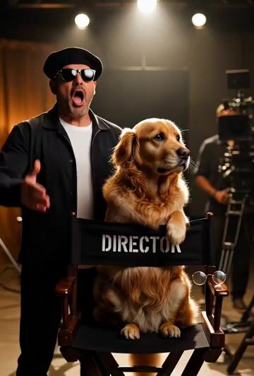A detailed video prompt for Grok Imagine describing a dramatic Hollywood director screaming 'CUT!' at a golden retriever sitting in a director's chair, who then calmly responds with a witty line, leading to applause from the crew.