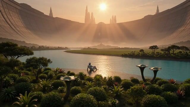 A detailed prompt for generating a cinematic, ultra-realistic hard sci-fi landscape video of a massive artificial ringworld, featuring a lone explorer by a crystal-clear river during the golden hour.