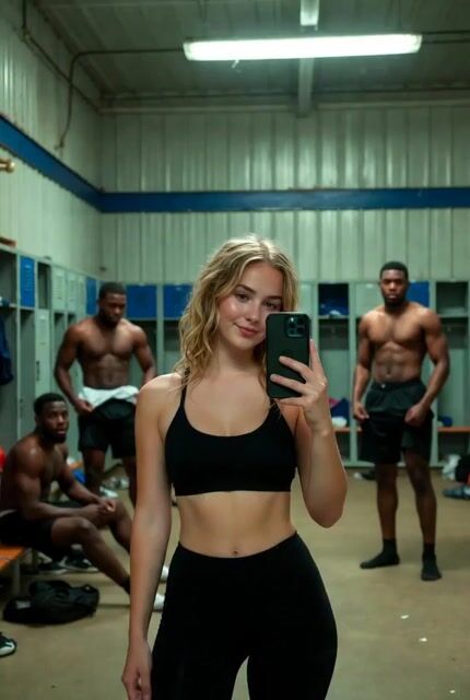 A prompt for Grok Imagine to generate a video depicting a young blonde woman taking a selfie in an African football locker room, surrounded by three black players.