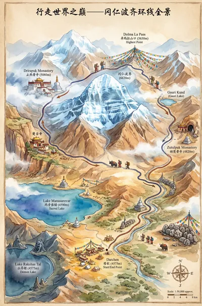 将徒步路线转化为艺术品。一键生成手绘水彩风格的详细地图插画,兼具地理准确与藏文化艺术美感,让你的旅程故事跃然纸上。