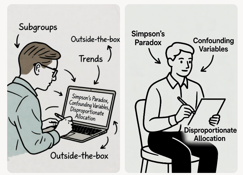 2. **检测辛普森悖论:**检查整体趋势是否在子组层面出现逆转或消失,若存在,解释原因(如样本大小权重不均)。如有暗示数据,用简单比例或示例量化说明。