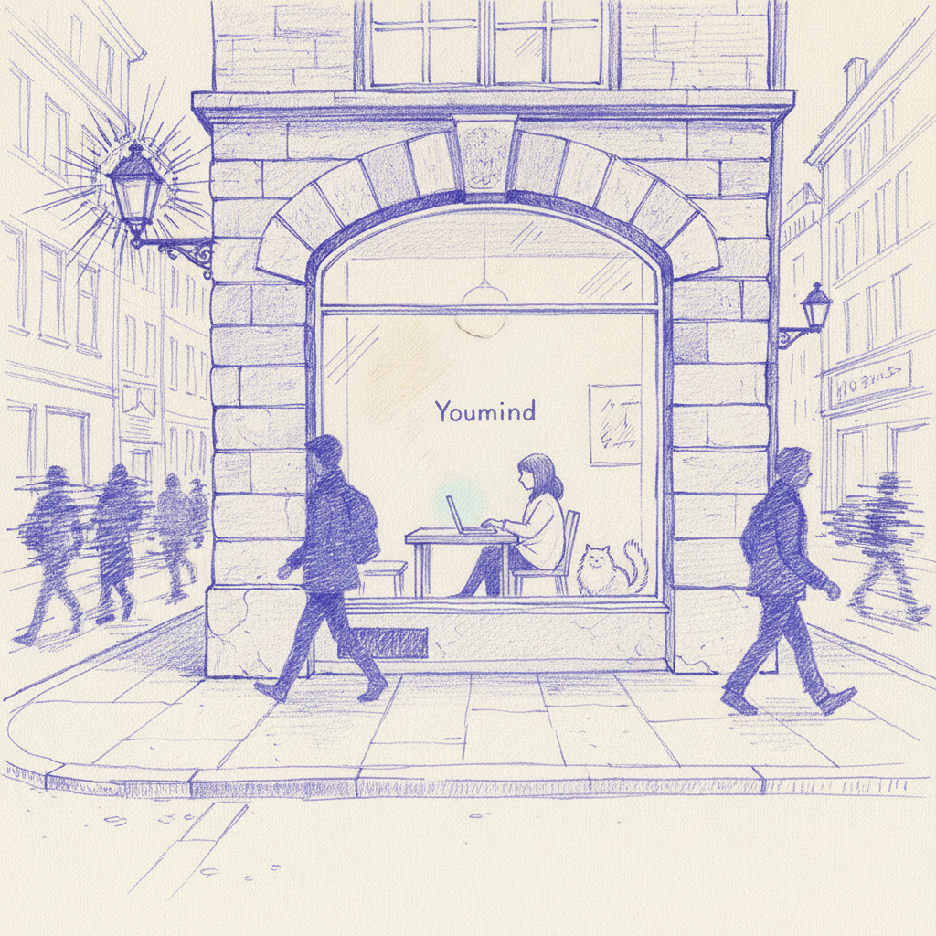 blue-violet ballpoint pen monochrome sketch, cool blue-violet base tone, low saturation, mostly midtones (≥ 75%), highlights not brighter than 20% paper white, visible paper texture and grain.