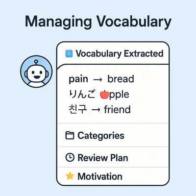 Automatically extract and organize vocabulary from your text, images, or audio, and manage it with categories, review plans, and progress tracking.