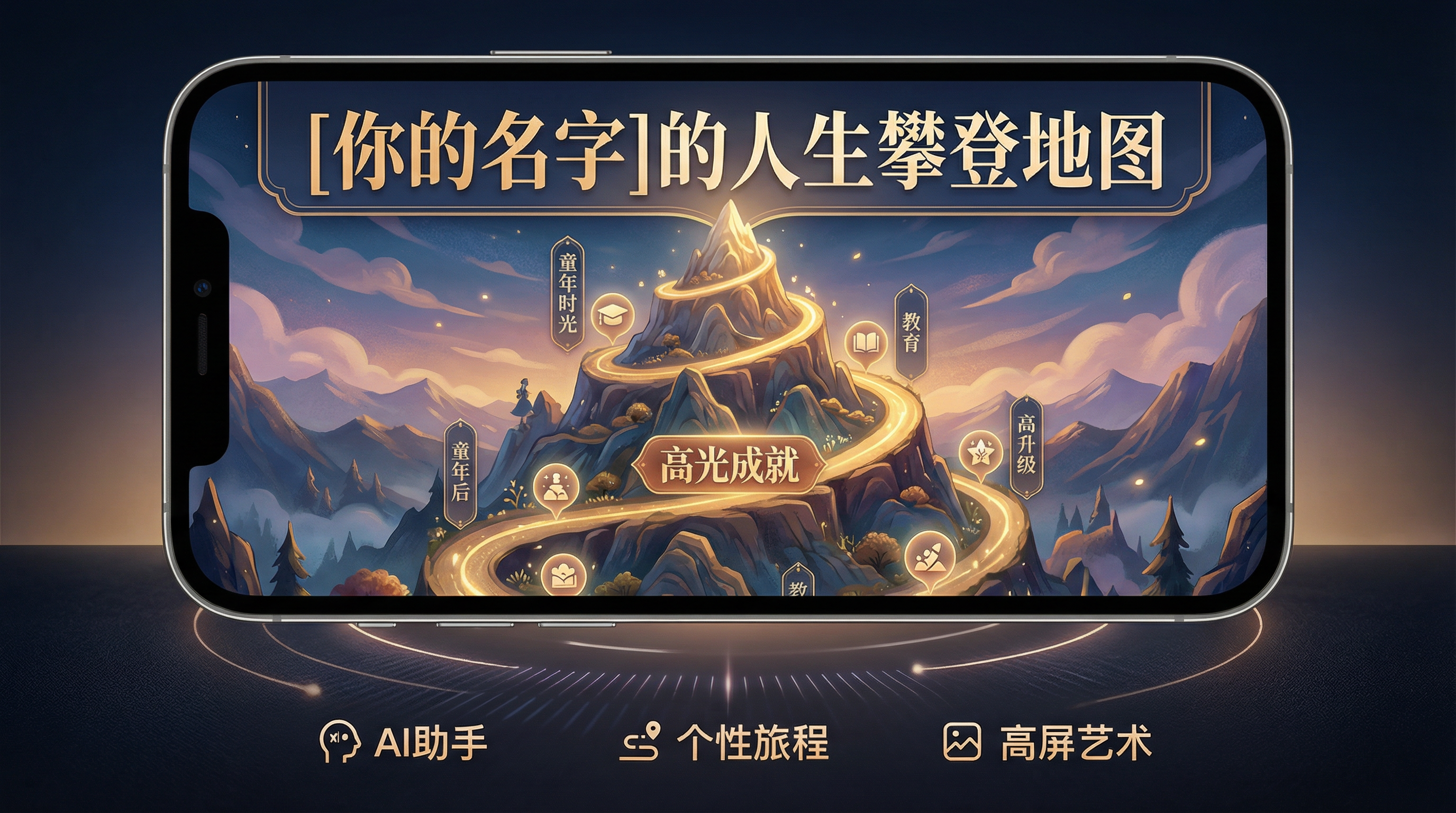 A HYPER-DETAILED, 4K resolution illustration of a majestic fantasy mountain displayed on a smartphone screen. The style is EXTREMELY intricate, warm, magical, hand-painted with maximalist detail and rich textures. The title banner at the top reads "[你的名字]的人生攀登地图".