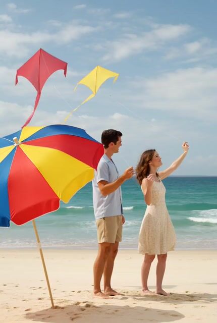 Um prompt cinematográfico detalhado para uma cena em estilo anos 1950 de um casal soltando pipas em uma praia, com detalhes específicos de iluminação e movimento.