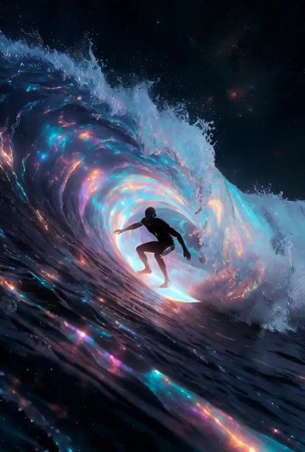 Um prompt de vídeo hiper-realista de uma pessoa surfando em uma onda feita de luz cósmica e cores vibrantes.