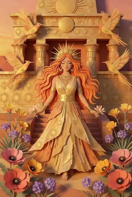 Um prompt altamente detalhado para criar um vídeo cinematográfico no estilo arte de papel, apresentando uma deusa do sol em um templo dourado.