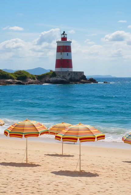 Um prompt descritivo para um vídeo de praia em estilo vintage, apresentando guarda-sóis, golfinhos saltando e um farol.