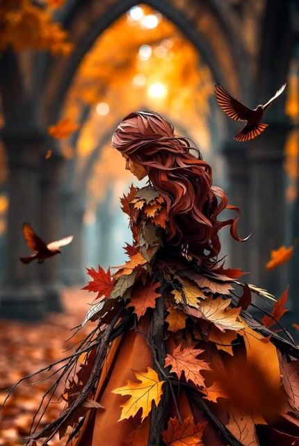 Um prompt extremamente detalhado para gerar um vídeo cinematográfico de uma rainha esculpida em papel, adornada com folhas de outono e cercada por pássaros em um cenário de catedral na floresta.