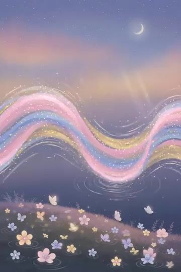 Um prompt descritivo para um vídeo surreal apresentando uma onda senoidal colorida que se transforma em flores e borboletas ao tocar o solo.