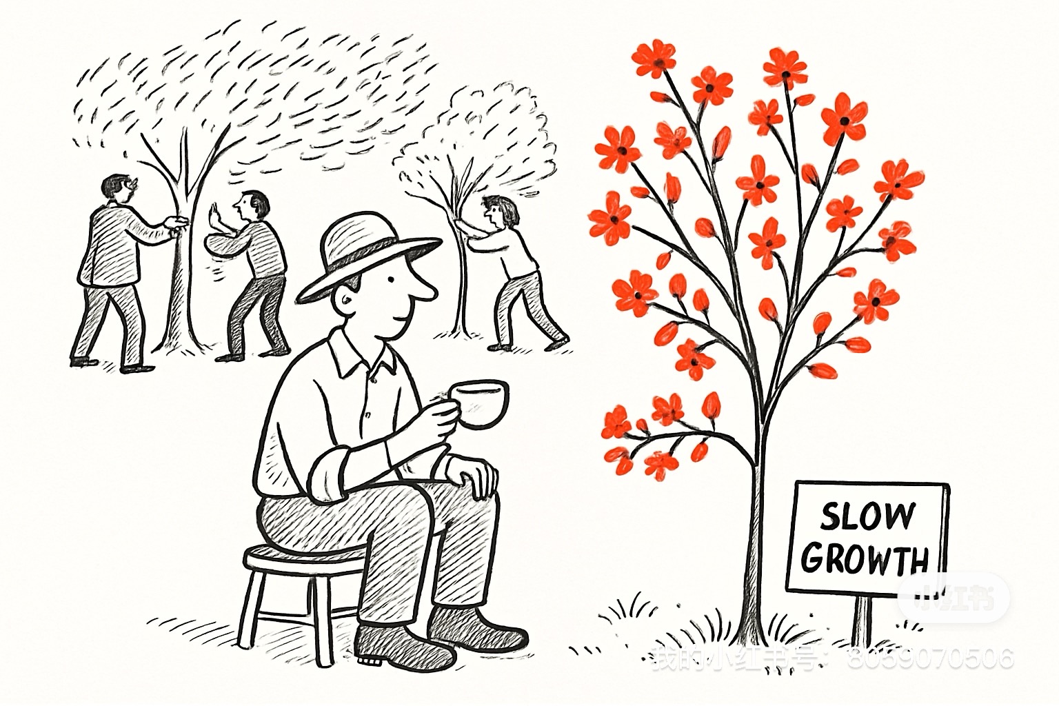 4. 基于以下提示词生成两个隐喻场景的图片:Draw a single-panel editorial cartoon in the style of The New Yorker – clean black ink outlines, flat white background, one accent colour (vermillion #E34234). . --ar 3:2”