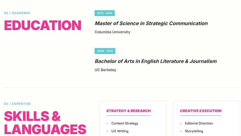 Crie websites pessoais minimalistas e impressionantes que projetem uma imagem de marca profissional e criativa. Esta habilidade traduz com maestria sua visão em uma presença online responsiva e elegante, com tipografia personalizada, uma paleta de cores vibrante e uma hierarquia de conteúdo clara. Perfeito para estrategistas de marca e criativos que desejam exibir sua marca pessoal única.