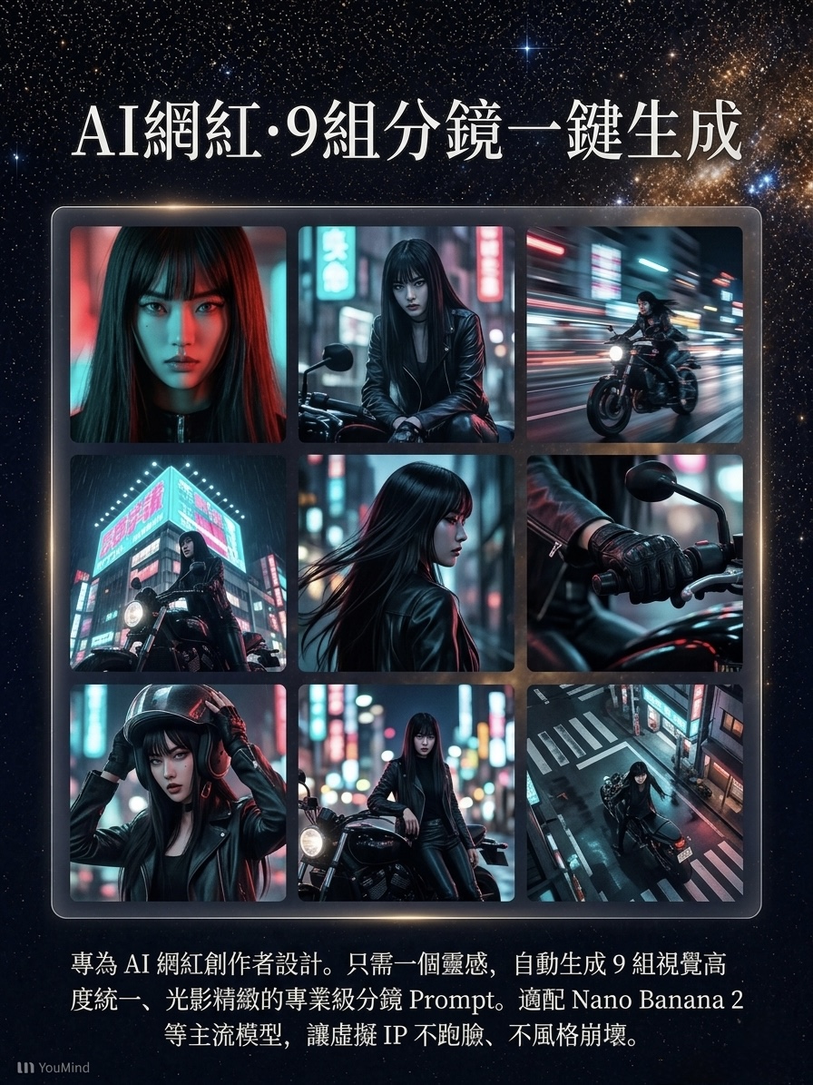Projetado especificamente para criadores de conteúdo influenciador com IA. Com apenas uma inspiração, gera automaticamente 9 conjuntos de storyboards de nível profissional com visuais altamente consistentes e iluminação impecável. É compatível com modelos populares como o Nano Banana 2, garantindo que sua propriedade intelectual virtual não distorça sua aparência ou estilo.