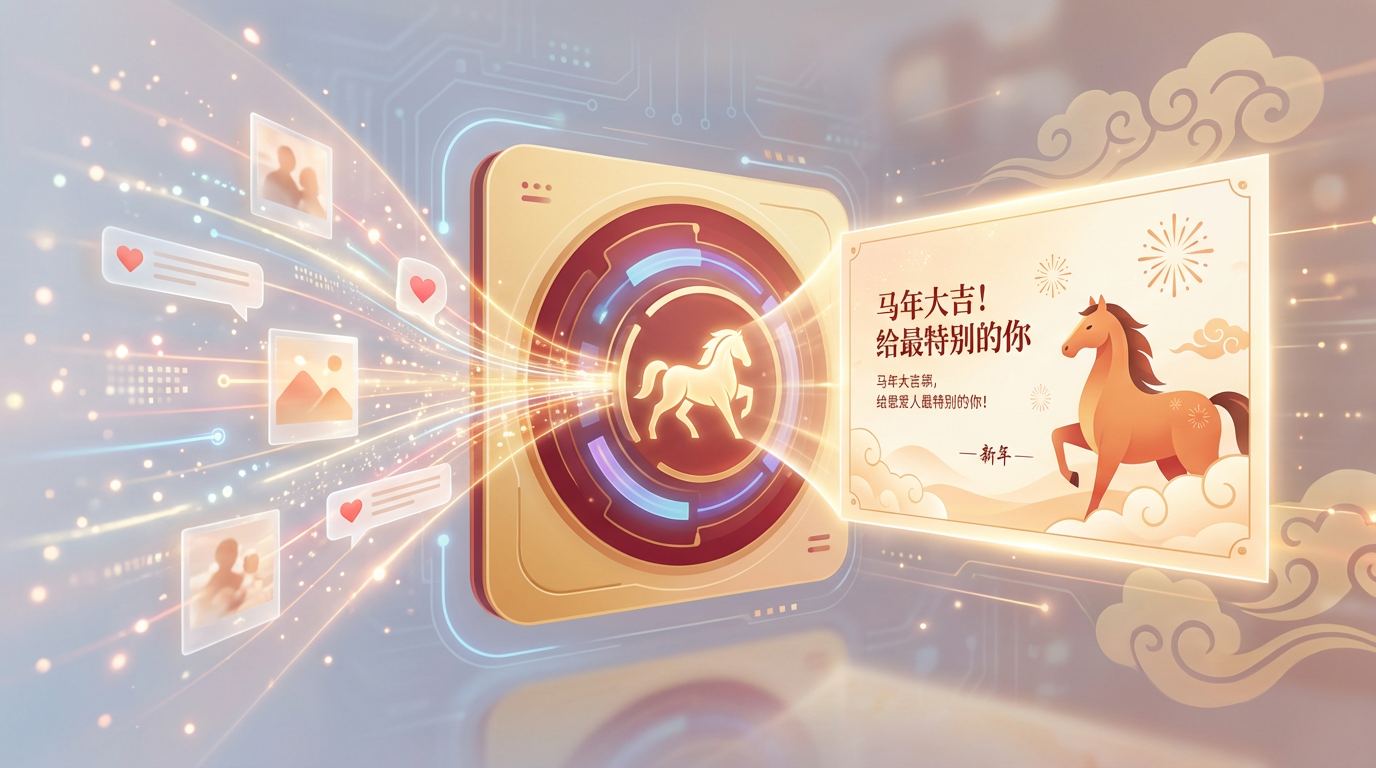 Create unique New Year's greeting cards for family and friends. Collect personal information through multi-round conversations to generate personalized greeting messages, and use AI to create beautiful visual cards. Supports various styles including warm and comforting, trendy modern Chinese style, and lively and playful, automatically matching the recipient's characteristics to ensure every blessing is heartfelt.