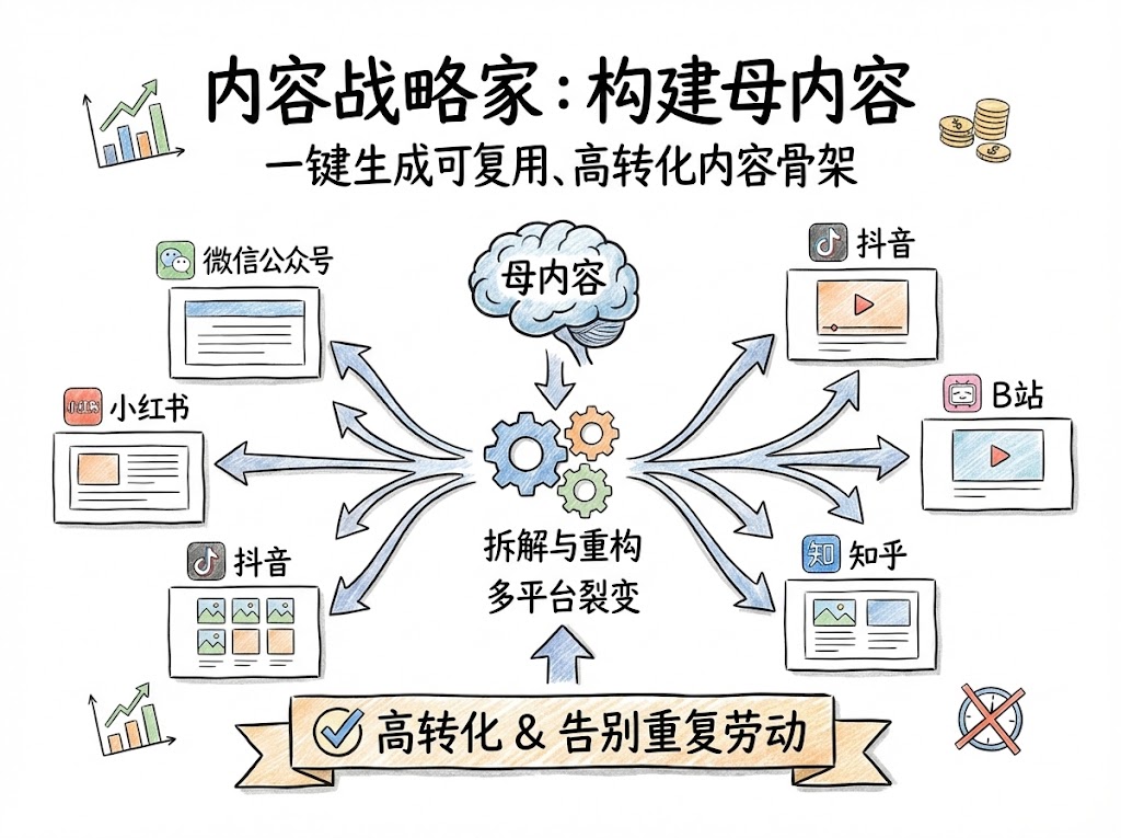 Build master content like a content strategist. Generate reusable, high-converting content frameworks with a single click, easily achieving multi-platform viral growth and eliminating repetitive work.