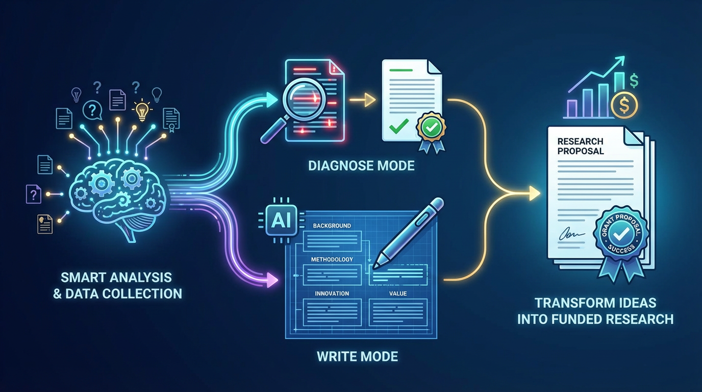 Based on best practices in writing research proposals, the system intelligently diagnoses existing content or assists in writing from scratch, automatically identifies the user's skill level and needs, and provides personalized optimization suggestions or high-quality drafts.