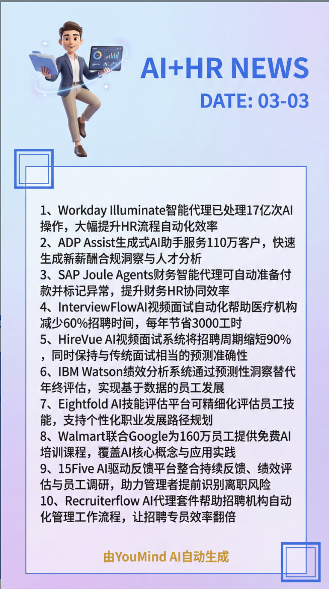 Generate a daily AI application case briefing in the HR field for human resource managers. Focused on areas such as recruitment, training, talent management, compensation incentives, and improving employee efficiency, it automatically searches and filters 10 real cases, generating clear and visually appealing briefing images and detailed text documents to help the team understand the latest trends in AI+HR.