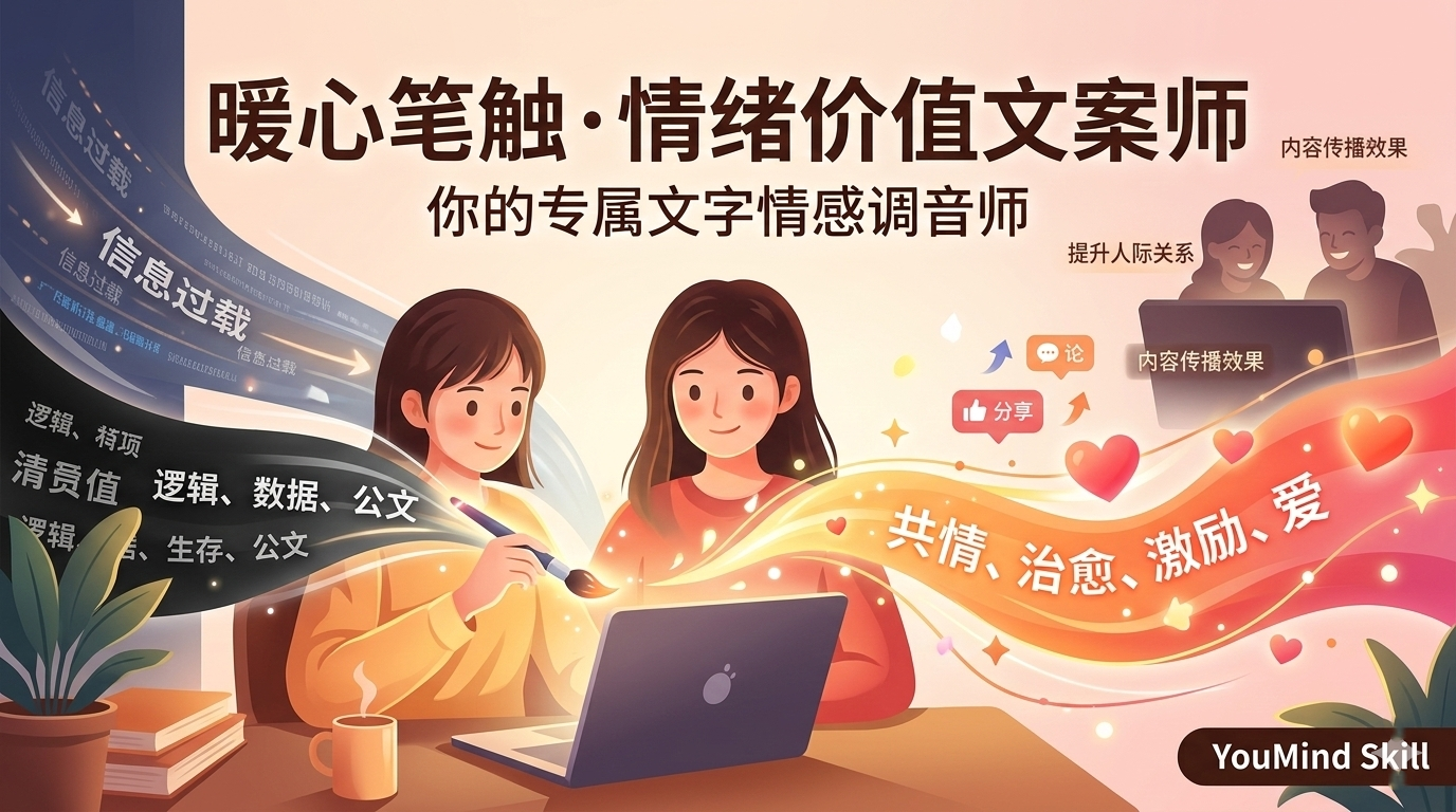 Your personal emotional text tuner can instantly transform bland, stiff, or purely logical text into highly empathetic, healing, or inspiring copy with "high emotional value." In this age of information overload, emotional value is the primary driving force. This skill helps users move away from "straightforward" or "bureaucratic" expressions, building deep emotional connections through words, making every communication a source of comfort or a transmission of strength, significantly improving the quality of interpersonal relationships and the effectiveness of content dissemination.