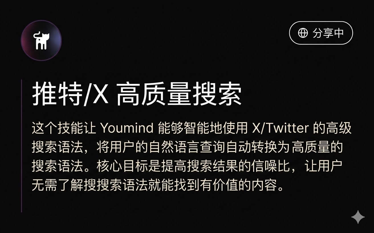 This skill allows Youmind to intelligently utilize X/Twitter's advanced search syntax, automatically converting users' natural language queries into high-quality search syntax. The core goal is to improve the signal-to-noise ratio of search results, enabling users to find valuable content without needing to understand search syntax.