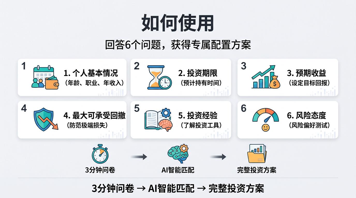 ## Step 1: Collect Customer Information Conduct a questionnaire survey with customers to collect the following key information: ### Required Questions: **1. Basic Information** - Your Age: _____ years old - Your Occupation: _____ - Annual Family Income: _____ RMB - Planned Investment Amount: _____ RMB **2. Investment Period** The investment period for this fund is: - A. 1-3 years - B. 3-5 years - C. 5-10 years - D. Over 10 years ⚠️ **Important**: If the customer selects A (1-3 years), immediately remind them: "Equity investments are recommended to be held for at least 3 years. Short-term funds are not recommended for equity funds; fixed income plus or pure bond products are recommended. Are you willing to extend the investment period, or consider more stable products?" **3. Expected Annualized Rate of Return** Your expected annualized rate of return: - A. 4-6% - B. 6-8% - C. 8-10% - D. 10-12% - E. Over 12% **4. Maximum Drawdown Tolerance** The maximum drawdown you can accept for your account (the maximum decline from the peak): - A. ≤8% - B. ≤10% - C. ≤15% - D. ≤20% - E. ≤25% 💡 **Explanation**: Drawdown refers to the decline in your account balance from its highest point to its lowest point. For example, if your account balance was 1 million at its highest and fell to 800,000 at its lowest, the drawdown would be 20%. **5. Investment Experience** Do you have experience investing in equity funds? - A. No, this is my first time - B. Yes, less than 1 year of investment experience - C. Yes, 1-3 years of investment experience - D. Yes, more than 3 years of investment experience ### Optional Question (In-depth Assessment): **6. Risk Attitude** Your attitude towards investment risk: - A. Risk-averse (Pursuing principal safety, unwilling to bear volatility) - B. Risk-prudent (Accepting small fluctuations, but hoping for maximum stability) - C. Risk-neutral (Accepting some volatility, pursuing reasonable returns) - D. Risk-active (Willing to bear greater volatility, pursuing higher returns) - E. Risk-seeking (Pursuing high returns, able to withstand large fluctuations) --- **Output Format**: Organize the information filled in by the client into structured data and pass it to the next step.