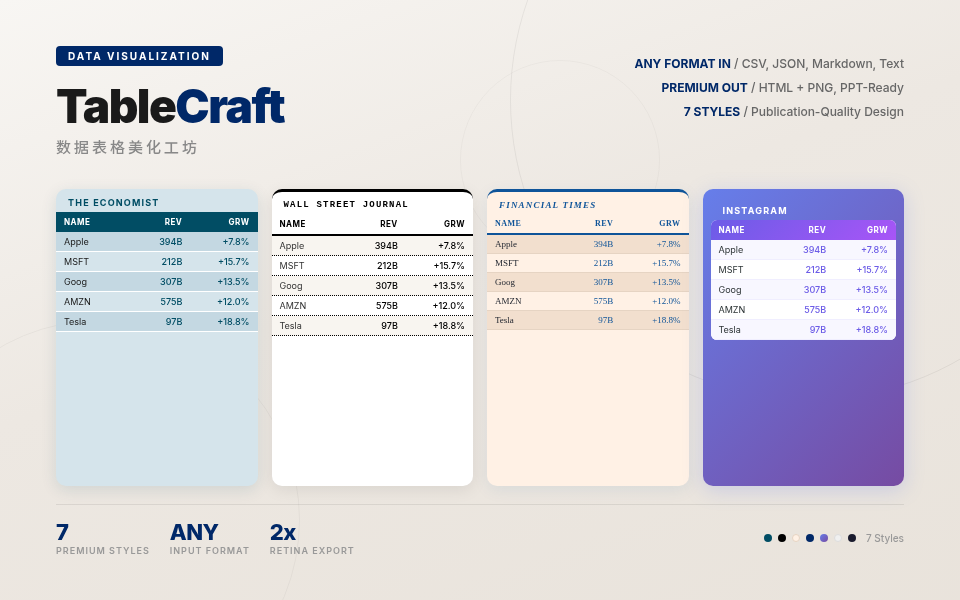 TableCraft -- 一键将任意格式的原始数据转化为出版级精美表格。内置 7 套顶级设计风格(经济学人 / 华尔街日报 / 金融时报 / 麦肯锡咨询 / Instagram社交 / 极简现代 / 暗黑高端),支持 CSV、JSON、Markdown、纯文本等任意输入,自动识别数值列并对齐,输出高清 HTML + PNG,可直接用于 PPT 汇报。专业排版,高端设计,拿来即用。