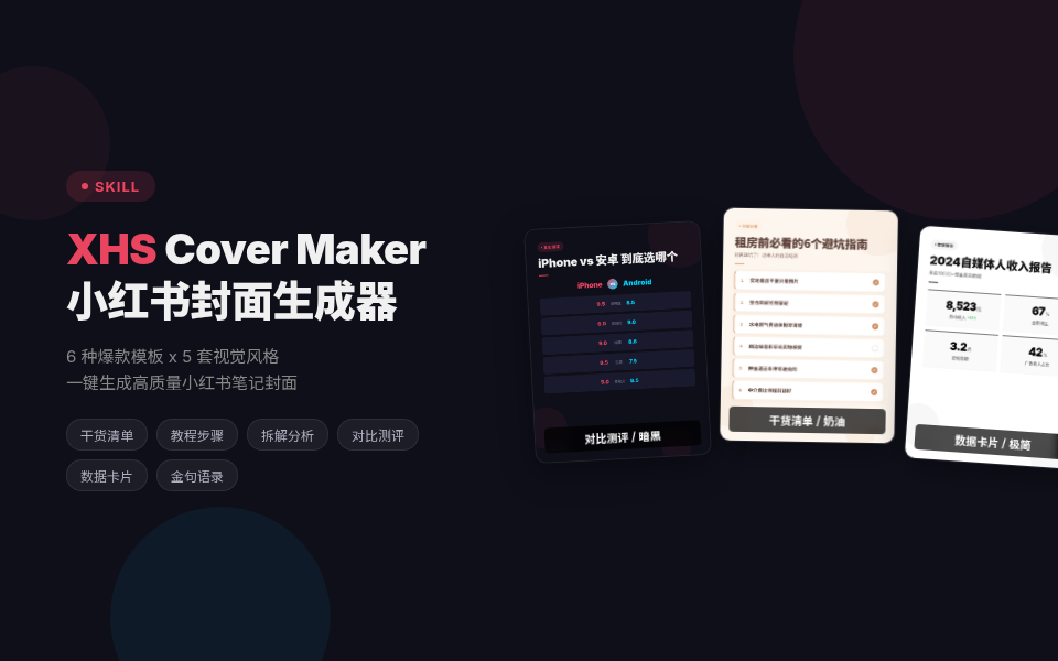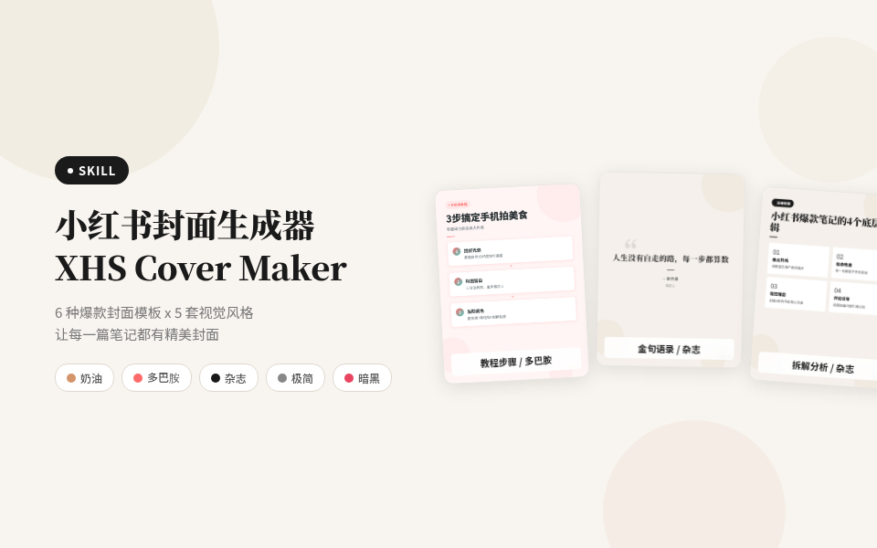 小红书博主的封面制作神器!内置 6 种爆款封面模板 -- 干货清单、教程步骤、拆解分析、对比测评、数据卡片、金句语录,搭配 5 套精心设计的视觉风格(奶油风/多巴胺/杂志风/极简风/暗黑酷),覆盖从美妆生活到科技测评的全部场景。只需描述你的笔记内容,即可一键生成 1080x1440 标准尺寸的精美封面图,告别封面焦虑,让每一篇笔记都有专业级视觉呈现。