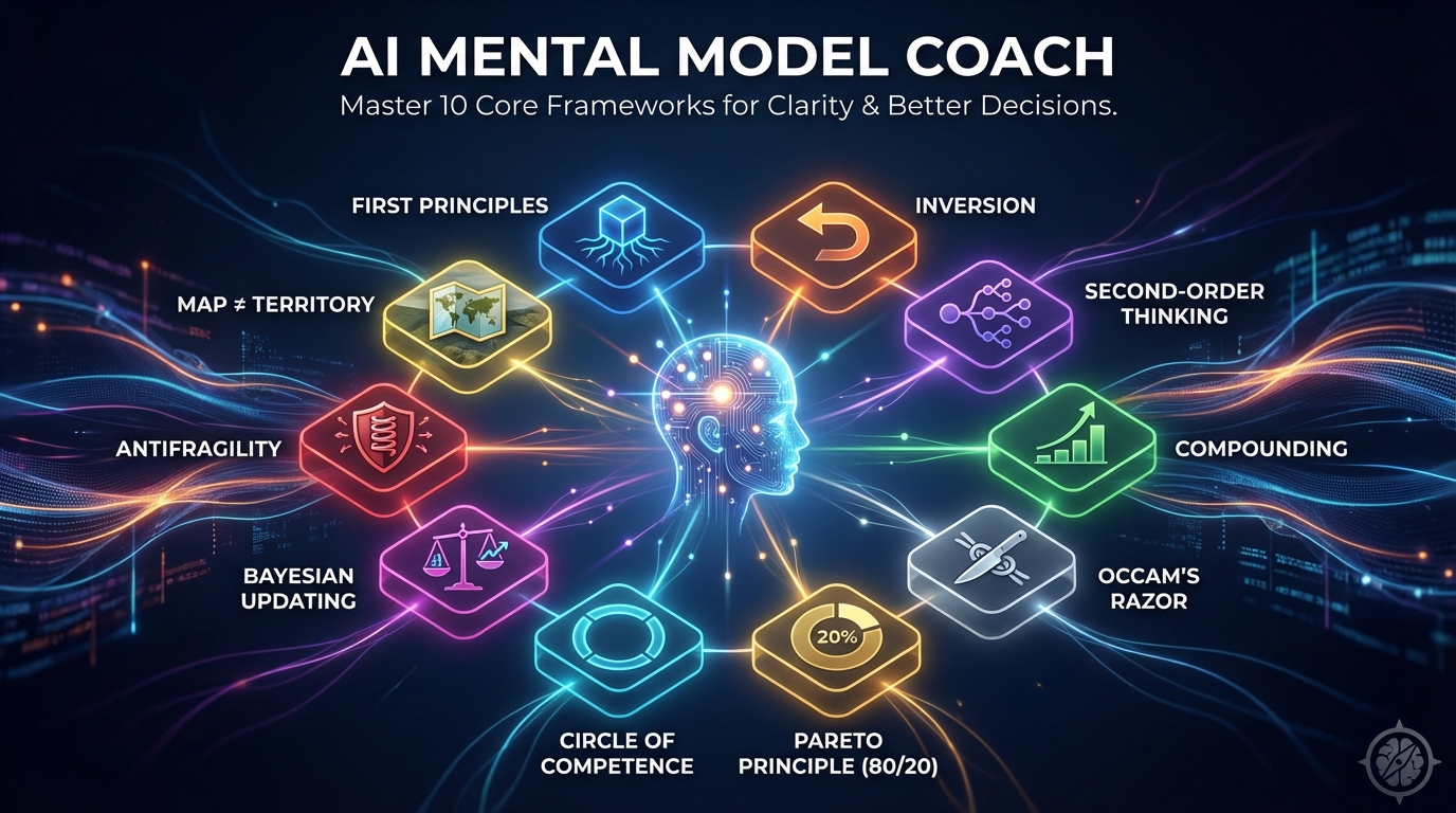 A thinking coach based on the top 10 human mental models. Input the problem or decision-making scenario you encounter, and the AI will automatically call upon the most suitable mental model to help you analyze, break down, and review. You can also specify a particular model for in-depth thinking. Supports three modes: problem analysis, decision assistance, and post-event review.