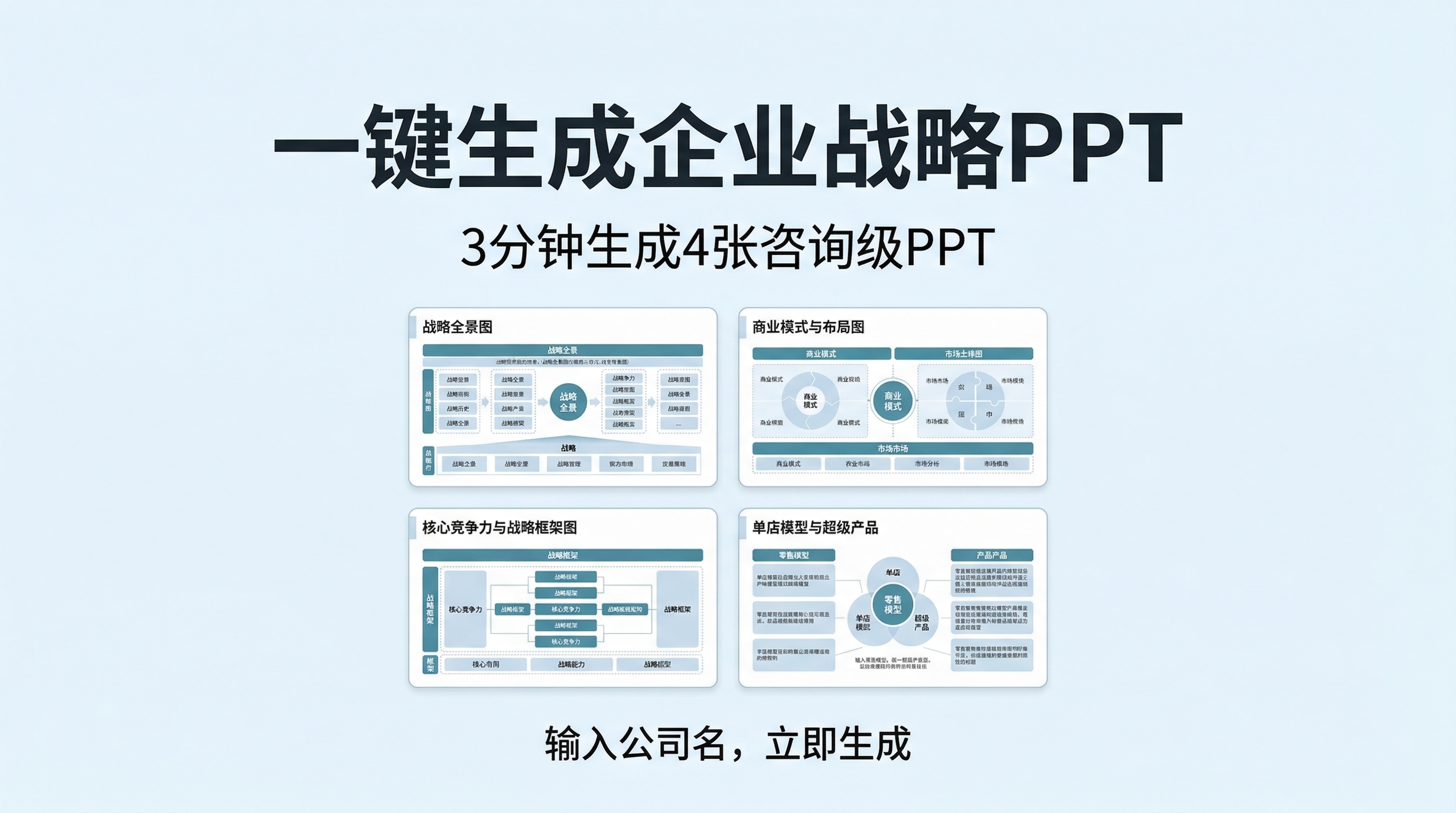In just five minutes, you can gain a clear understanding of and even generate company case studies. Simply enter any company name, and you can generate four consulting firm-level strategic analysis PPTs with a single click. The process includes automatic intelligence gathering → strategic viewpoint extraction → visualization image generation → core insight output. Suitable for PPT creation, case studies, business analysis, and learning reference. Six cases have been validated: Songtsam, XPeng, Pangdonglai, Pinduoduo, Aier Eye Hospital, and Tea'Stone.