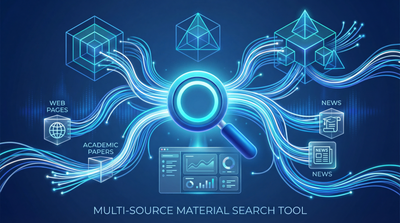 A one-stop content search tool that collects materials from multiple channels (general web pages, academic papers, etc.) and generates a summary table of serious content and media content with citations. It supports a two-step process: first, search through multiple channels, then filter and integrate to output a structured report.