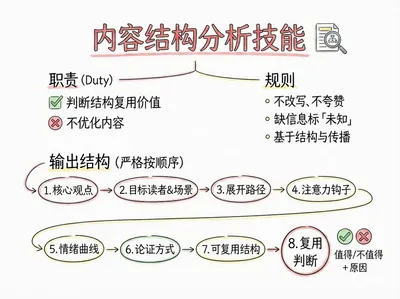 Input any content (article/post/video script/transcribed text) and output a structured judgment on whether the content is "worth reusing".