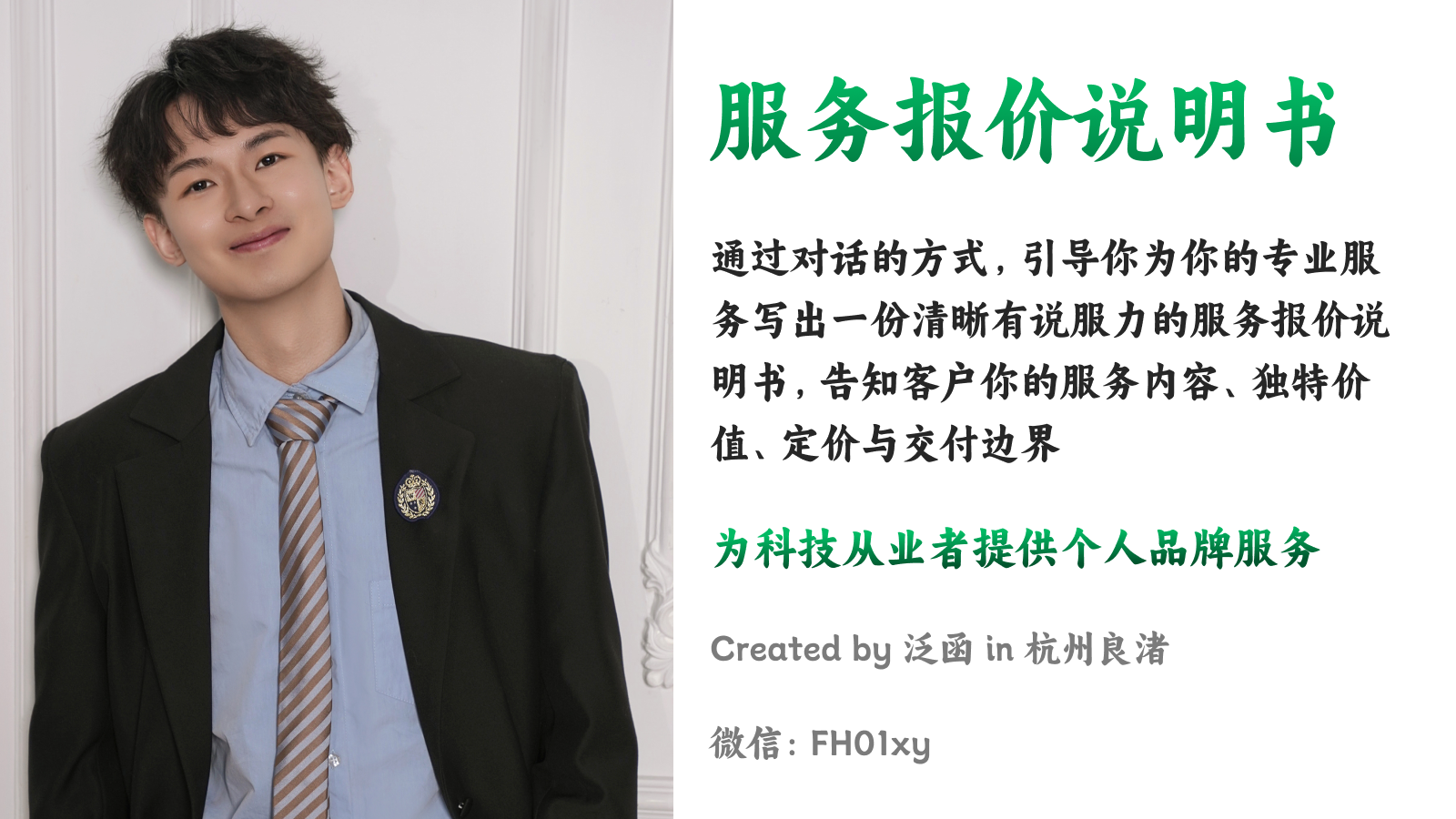 Through dialogue, we guide you, as a freelancer, independent studio, OPC, or independent consultant, to write a clear and persuasive service quote for your professional services, informing clients of your service content, unique value, pricing, and delivery boundaries.