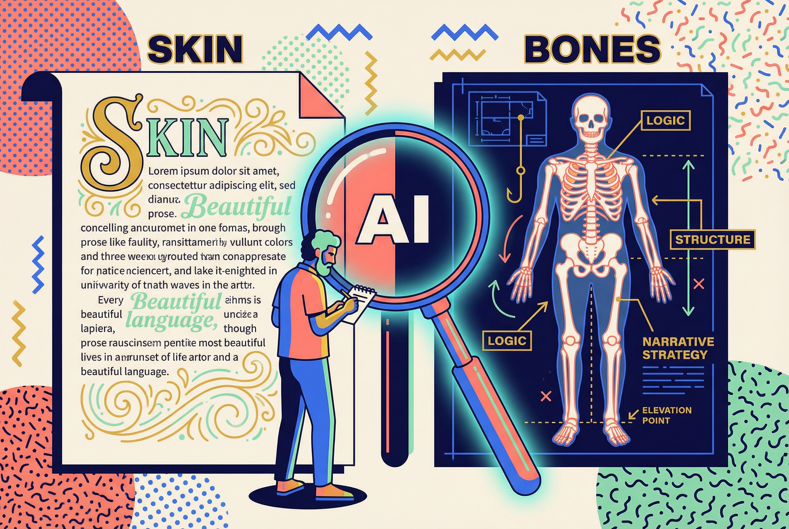 ร้อยแก้วที่สวยงามและเสียงที่เป็นเอกลักษณ์คือ*ผิวหนัง* ตรรกะ โครงสร้าง และกลยุทธ์การเล่าเรื่องคือ*กระดูก*.