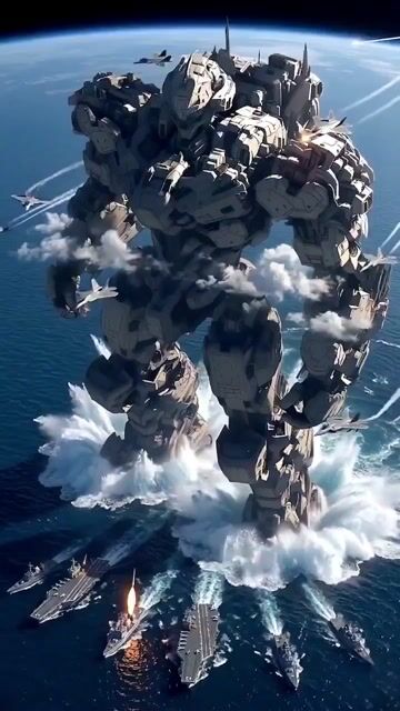 ฉากแอ็กชันระดับมหากาพย์ หุ่นยนต์เมชาแห่งอนาคตขนาดยักษ์สูง 200 เมตร ชื่อ "Xeno Leviathan Terraformer" ยืนตระหง่านอยู่กลางมหาสมุทรเหนือฝูงเรือรบ หุ่นยนต์ยักษ์ตัวนี้หุ้มด้วยเกราะหนาพร้อมรายละเอียดทางกลไกที่ซับซ้อน ดวงตาสีฟ้าเรืองแสง และลวดลายพลังงานสีส้ม มันกำลัง…