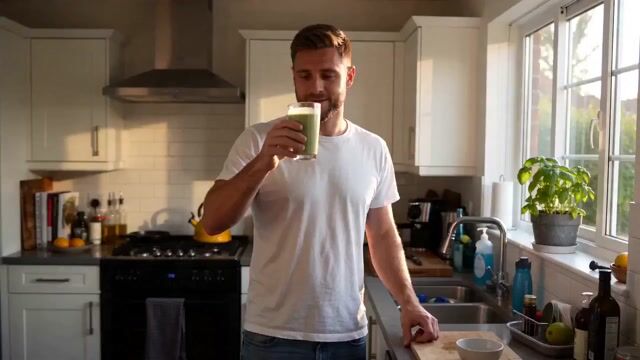 By@Gilbert Odera | Your AI Plug🇰🇪Apr 15, 2026ดูพรอมต์ฉบับเต็มชายวัยปลาย 20 ปี สวมเสื้อยืดสีขาวลำลองและกางเกงยีนส์ ถือสมูทตี้สีเขียวขึ้นมาจิบแล้วยิ้มให้กล้อง ห้องครัวสว่างสดใส มีแสงแดดตอนเช้าส่องจากด้านหลัง ภาพแบบถือกล้องถ่าย มีการสั่นไหวเล็กน้อยอย่างเป็นธรรมชาติ โทนสีอบอุ่น ดูสมจริงลองใช้เลย