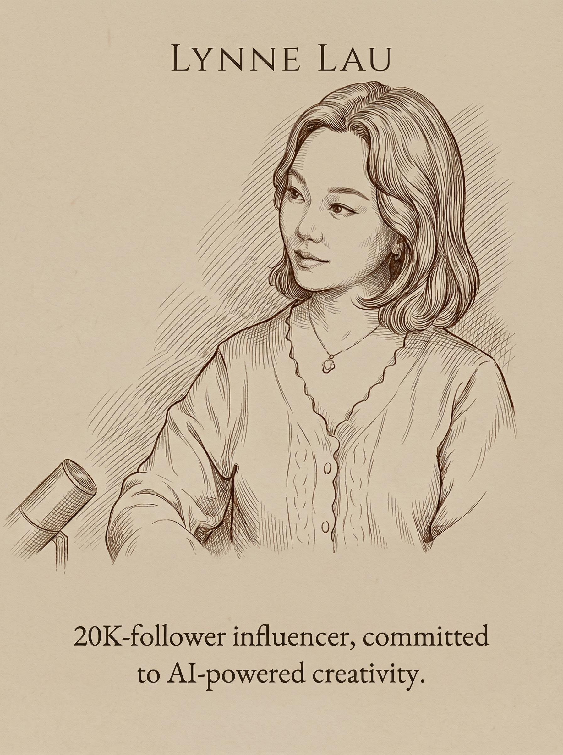ตรงกลาง: ภาพวาดเส้นแบบคลาสสิกในสไตล์ภาพพิมพ์ยุคเรเนสซองส์ เส้นหมึกและลายเส้นละเอียดอ่อน พร้อมการแรเงาแบบไขว้ละเอียด โทนสีน้ำตาลซีเปีย/น้ำตาลอบอุ่น ควรวางภาพไว้ตรงกลาง โดยแสดงศีรษะและไหล่ส่วนบนในรูปแบบภาพเหมือนแบบดั้งเดิม ความสวยงามแบบวาดด้วยมือ พร้อมเส้นขอบที่สง่างาม