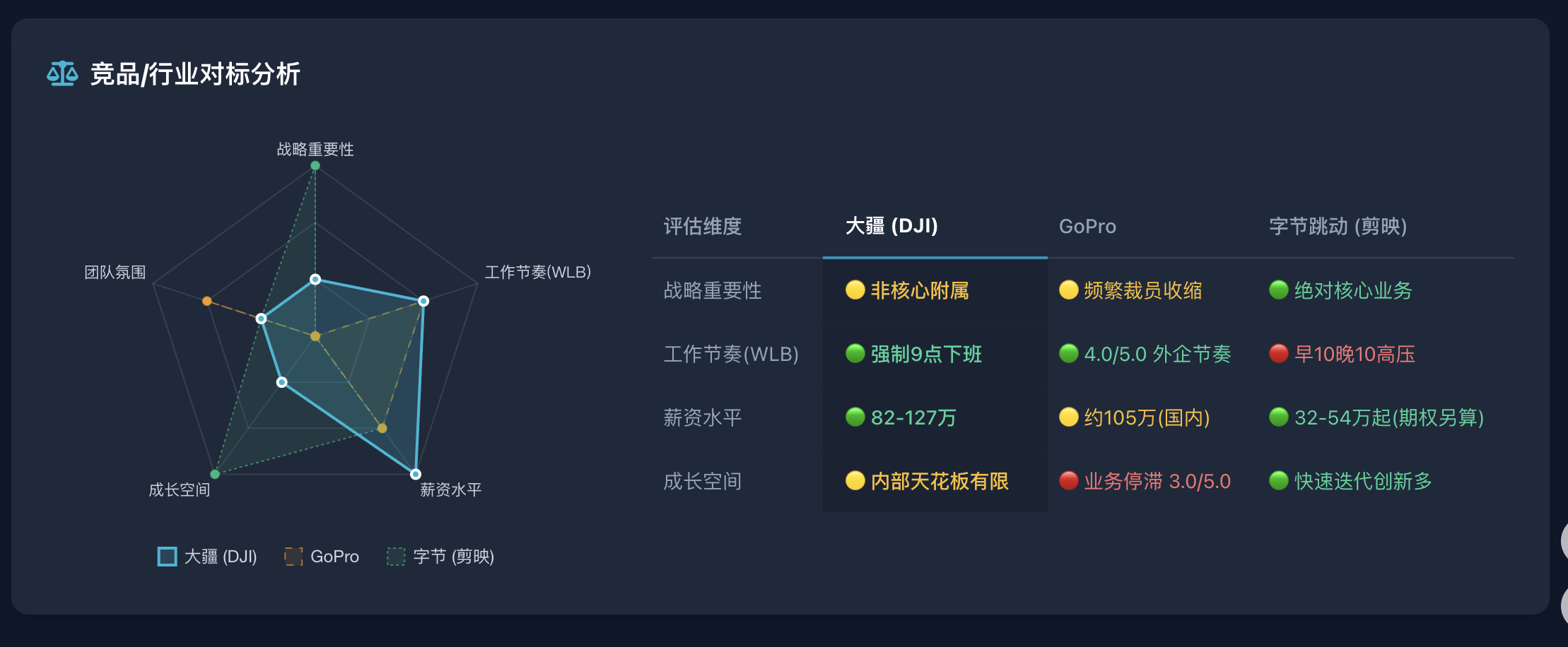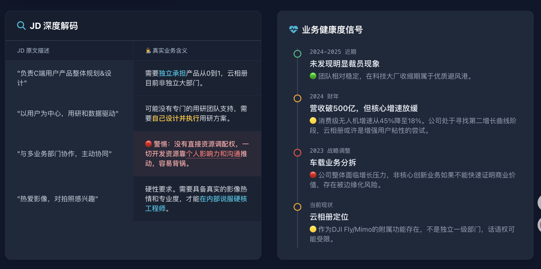 เครื่องมือรายงานข้อมูลเชิงลึกด้านงานอีเวนต์นี้ ช่วยให้ผู้หางานวิเคราะห์บริษัทเป้าหมาย หน่วยธุรกิจ และตำแหน่งงานได้อย่างครอบคลุม เปิดเผยสถานการณ์ที่แท้จริงเบื้องหลังข้อมูลการรับสมัครงาน ออกแบบมาสำหรับผู้หางานที่ต้องการทำการวิจัยอย่างละเอียดและทำความเข้าใจความเสี่ยงและโอกาสที่อาจเกิดขึ้นก่อนสมัคร เพียงแค่ป้อนรายละเอียดงาน (รองรับการแคปหน้าจอ การคัดลอกข้อความ หรือลิงก์การรับสมัครงาน) เครื่องมือจะดึงข้อมูลสำคัญโดยอัตโนมัติและแปลศัพท์เฉพาะทางด้านทรัพยากรบุคคลให้เป็นภาษาที่เข้าใจง่าย เปิดเผยข้อกำหนดที่ซ่อนอยู่ของตำแหน่งงาน จากนั้น เครื่องมือจะใช้การค้นหาเว็บแบบเรียลไทม์เพื่อวิเคราะห์เชิงลึกเกี่ยวกับตำแหน่งเชิงกลยุทธ์ของหน่วยธุรกิจภายในบริษัท การพัฒนาล่าสุด การเลิกจ้างหรือการปรับโครงสร้าง และแนวโน้มอุตสาหกรรม ในขณะเดียวกัน เครื่องมือจะรวบรวมรีวิวจากพนักงานจริงจากแพลตฟอร์มต่างๆ เช่น Zhihu, Xiaohongshu และ Maimai กรองความคิดเห็นที่เฉพาะเจาะจงและละเอียดเพื่อให้คุณเข้าใจถึงบรรยากาศการทำงานภายใน จุดแข็ง และจุดอ่อน สุดท้าย เครื่องมือจะเลือกสองบริษัทที่แข่งขันกับบริษัทเป้าหมายของคุณในสาขาเดียวกันเพื่อเปรียบเทียบตำแหน่งงานที่คล้ายคลึงกัน ประเมินความสำคัญเชิงกลยุทธ์ ความเร็วในการทำงาน ศักยภาพในการเติบโต และระดับเงินเดือน ผลการวิเคราะห์ทั้งหมดจะถูกรวบรวมไว้ในรายงานข่าวกรองเชิงลึกที่มีโครงสร้างชัดเจนและมีเหตุผล เพื่อช่วยให้คุณตัดสินใจเลือกเส้นทางอาชีพได้อย่างชาญฉลาด